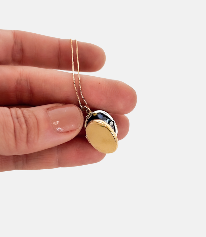 With its minimalist, oval shape and simple lines, it is a jewel full of meaning — created to hold close to your heart what already lives within it. Inside, you can place a small photo or drawing of a loved one, making it uniquely yours.
